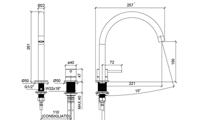 מידות: קוטר ידית 40 מ"מ, גובה פיה 261 מ"מ
