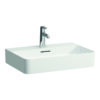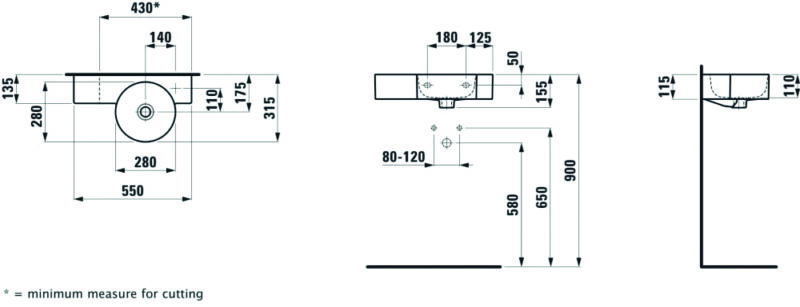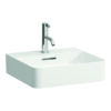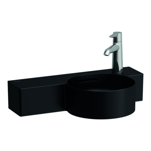 כיור תלוי קטן עגול עם מדף בצד שמאל